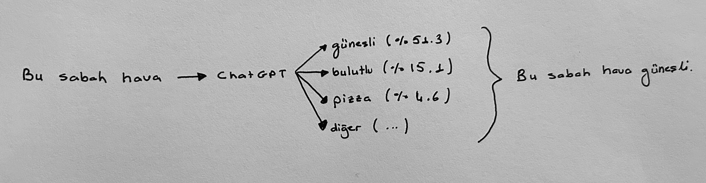 Bu kadar yazıyla eğitilen büyük dil modellerinin çalışma prensibine bakarsak, en temelinde bu modeller bazı kelime dizilimlerinden sonra hangi kelimenin gelmesinin daha olası olduğunu hesaplayarak o ödevimizi yaparken kullandığımız cümleleri oluşturuyorlar: